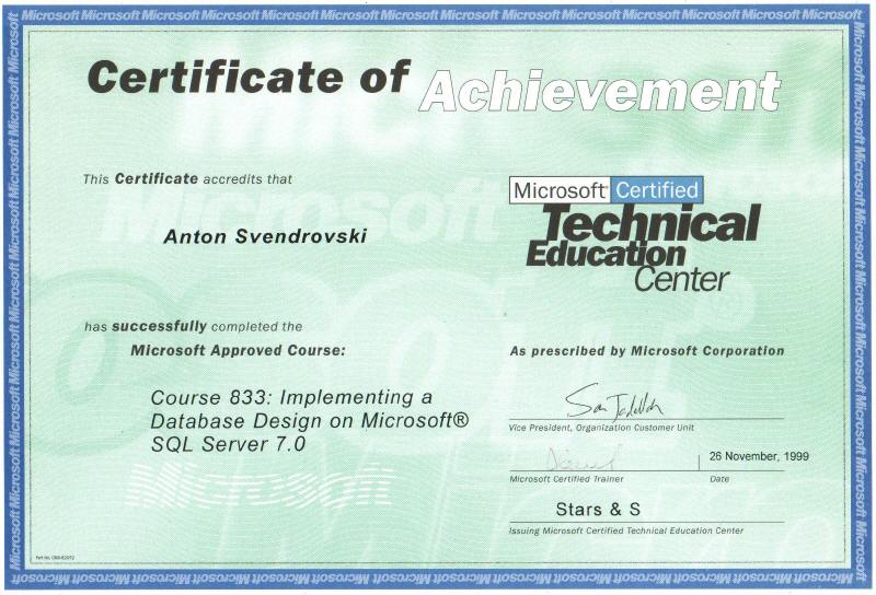 Microsoft Course #833: "Implementing a Database Design on Microsoft SQL Server 7.0" |